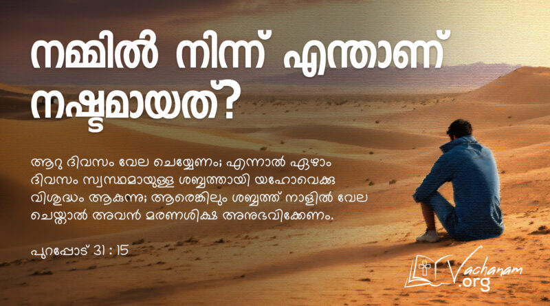 Read Moreവചനം പുറപ്പോട് 31 : 15 ആറു ദിവസം വേല ചെയ്യേണം; എന്നാൽ ഏഴാം ദിവസം സ്വസ്ഥമായുള്ള ശബ്ബത്തായി യഹോവെക്കു വിശുദ്ധം ആകുന്നു; ആരെങ്കിലും ശബ്ബത്ത് നാളിൽ