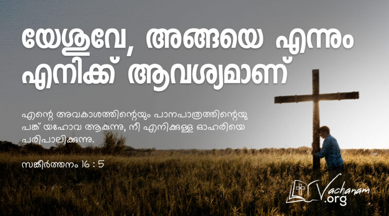 Read Moreവചനം സങ്കീർത്തനം 16 : 5 എന്റെ അവകാശത്തിന്റെയും പാനപാത്രത്തിന്റെയു പങ്ക് യഹോവ ആകുന്നു, നീ എനിക്കുള്ള ഓഹരിയെ പരിപാലിക്കുന്നു. നിരീക്ഷണം യഹോവേ, എനിക്കുള്ള ഓഹരിയെ പരിപാലിക്കുവാനും