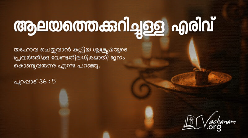 Read Moreവചനം പുറപ്പാട് 36 : 5 യഹോവ ചെയ്യുവാൻ കല്പിച്ച ശുശ്രൂഷയുടെ പ്രവർത്തിക്കു വേണ്ടതിലധികമായി ജനം കൊണ്ടുവരുന്നു എന്നു പറഞ്ഞു. നിരീക്ഷണം മരുഭൂമിയിൽ യഹോവയ്ക്ക് ഒരു വിശുദ്ധ