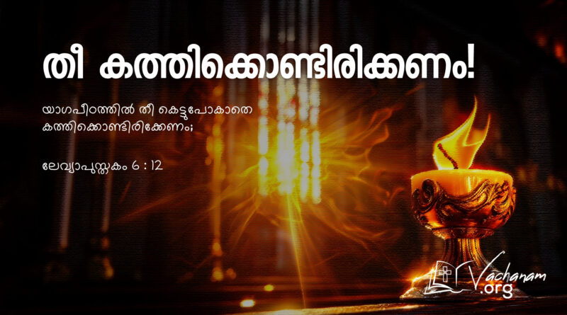 Read Moreവചനം ലേവ്യാപുസ്തകം 6 : 12 യാഗപീഠത്തിൽ തീ കെട്ടുപോകാതെ കത്തിക്കൊണ്ടിരിക്കേണം; നിരീക്ഷണം പഴയ നിയമ പുരോഹിതന്മാരോടുള്ള ദൈവത്തിന്റെ നിർദ്ദേശമാണ് യാഗപീഠത്തിൽ തീ എപ്പോഴും കത്തിക്കൊണ്ടിരിക്കണം എന്നുള്ളത്.