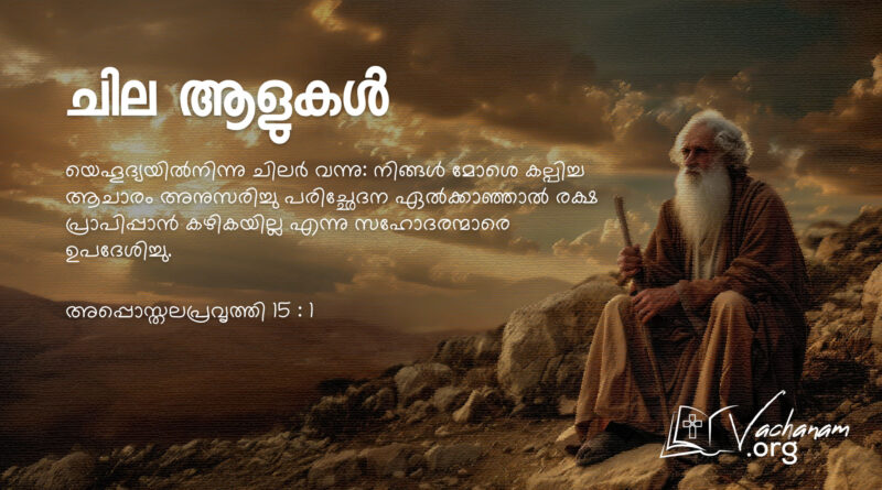 Read Moreവചനം അപ്പൊസ്തലപ്രവൃത്തി 15 : 1 യെഹൂദ്യയിൽനിന്നു ചിലർ വന്നു: നിങ്ങൾ മോശെ കല്പിച്ച ആചാരം അനുസരിച്ചു പരിച്ഛേദന ഏൽക്കാഞ്ഞാൽ രക്ഷ പ്രാപിപ്പാൻ കഴികയില്ല എന്നു സഹോദരന്മാരെ