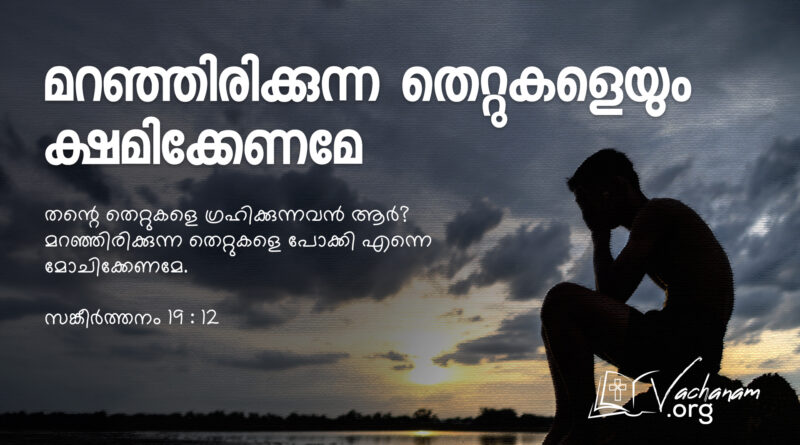 Read Moreവചനം സങ്കീർത്തനം 19 : 12 തന്റെ തെറ്റുകളെ ഗ്രഹിക്കുന്നവൻ ആർ? മറഞ്ഞിരിക്കുന്ന തെറ്റുകളെ പോക്കി എന്നെ മോചിക്കേണമേ. നിരീക്ഷണം ദാവീദ് രാജാവിന്റെ ജീവിതത്തിൽ മറഞ്ഞിരിക്കുന്ന അനേകം