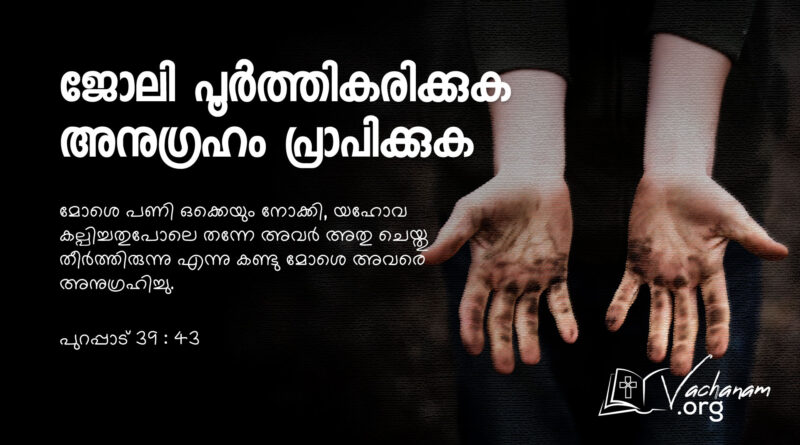 Read Moreവചനം പുറപ്പാട് 39 : 43 മോശെ പണി ഒക്കെയും നോക്കി, യഹോവ കല്പിച്ചതുപോലെ തന്നേ അവർ അതു ചെയ്തു തീർത്തിരുന്നു എന്നു കണ്ടു മോശെ അവരെ