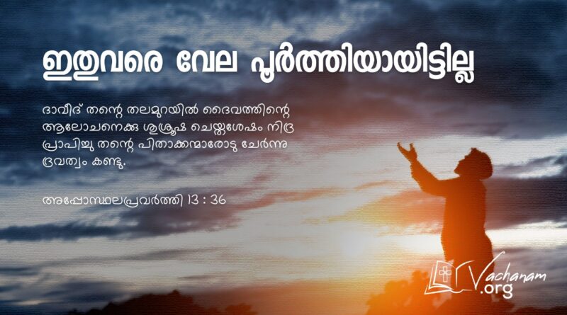 Read Moreവചനം അപ്പോസ്ഥലപ്രവർത്തി 13 : 36 ദാവീദ് തന്റെ തലമുറയിൽ ദൈവത്തിന്റെ ആലോചനെക്കു ശുശ്രൂഷ ചെയ്തശേഷം നിദ്ര പ്രാപിച്ചു തന്റെ പിതാക്കന്മാരോടു ചേർന്നു ദ്രവത്വം കണ്ടു. നിരീക്ഷണം